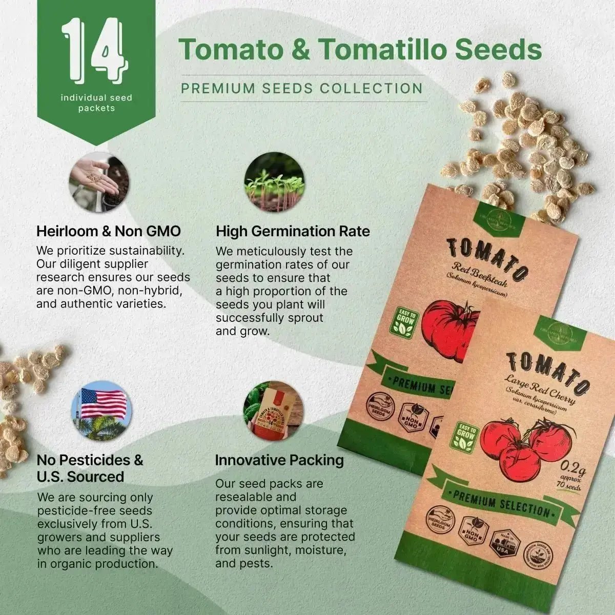 Elevate your gardening experience with the Organo Republic 14 Rare Tomato & Tomatillo Garden Seeds Variety Pack. These non-GMO heirloom seeds offer incredible value, with over 1,025 seeds for less than $1.80 per variety. This pack includes a diverse range of tomatoes and tomatillos: Tomatillo Cape Gooseberry, Tomatillo Grande Rio Verde, Tomato Amana Orange, Tomato Caribe, Tomato Dr. Wyche's Yellow, Tomato Flame, Tomato Large Cherry, Tomato Pink Thai Egg, Tomato Red Beefsteak, Tomato Red Pear, Tomato Roma VF, Tomato White Beefsteak, Tomato Yellow Pear, and Tomato Yellow Stuffer.
