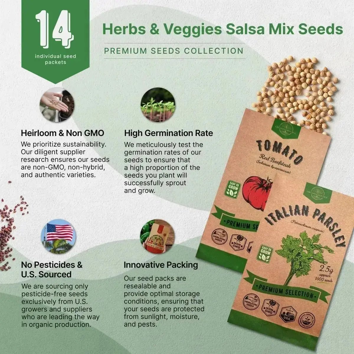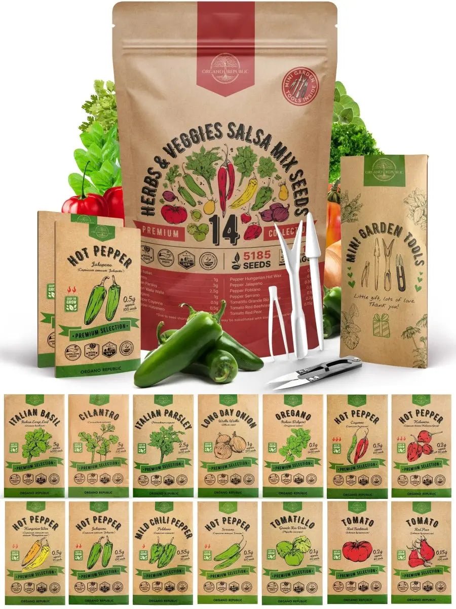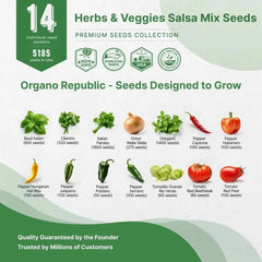 Elevate your gardening experience with the Organo Republic 14 Herbs & Veggies Salsa Mix Seeds Variety Pack. These non-GMO heirloom seeds provide incredible value, with over 5,180 seeds for less than $1.80 per variety. This pack includes a diverse range of vegetables and herbs: Basil Italian, Cilantro, Italian Parsley, Onion Walla Walla, Oregano, Pepper Cayenne, Pepper Habanero, Pepper Hungarian Hot Wax, Pepper Jalapeno, Pepper Poblano, Pepper Serrano, Tomatillo Grande Rio Verde, Tomato Red Beefsteak, and Tomato Red Pear.