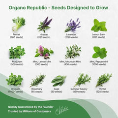 Elevate your gardening experience with the Organo Republic 25 Most Popular Herb Seeds Variety Pack. These non-GMO heirloom seeds offer incredible value, with over 11,790 seeds for less than $1.10 per variety. This pack includes a diverse range of the most popular herbs: Anise, Basil Italian, Basil Lemon, Basil Purple, Basil Thai, Bergamot, Borage, Catnip, Chervil, Chives, Cilantro, Dill, Fennel, Hyssop, Lavender, Lemon Balm, Marjoram, Lemon Mint, Mountain Mint, Peppermint, Oregano, Rosemary, Sage, Summer Savory, and Thyme.