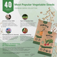 Our vegetable seeds variety pack provides a comprehensive solution for any gardener. Each seed variety undergoes rigorous testing with a 90%+ germination rate, ensuring high-quality, non-GMO, heirloom, and pesticide-free seeds. Sourced from the most reliable U.S. suppliers and growers, our seeds are packed in a waterproof resealable bag to keep them fresh and protected from sunlight.
