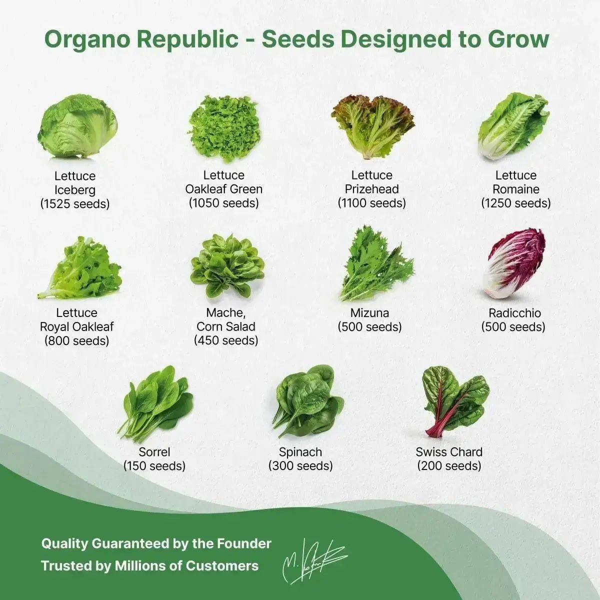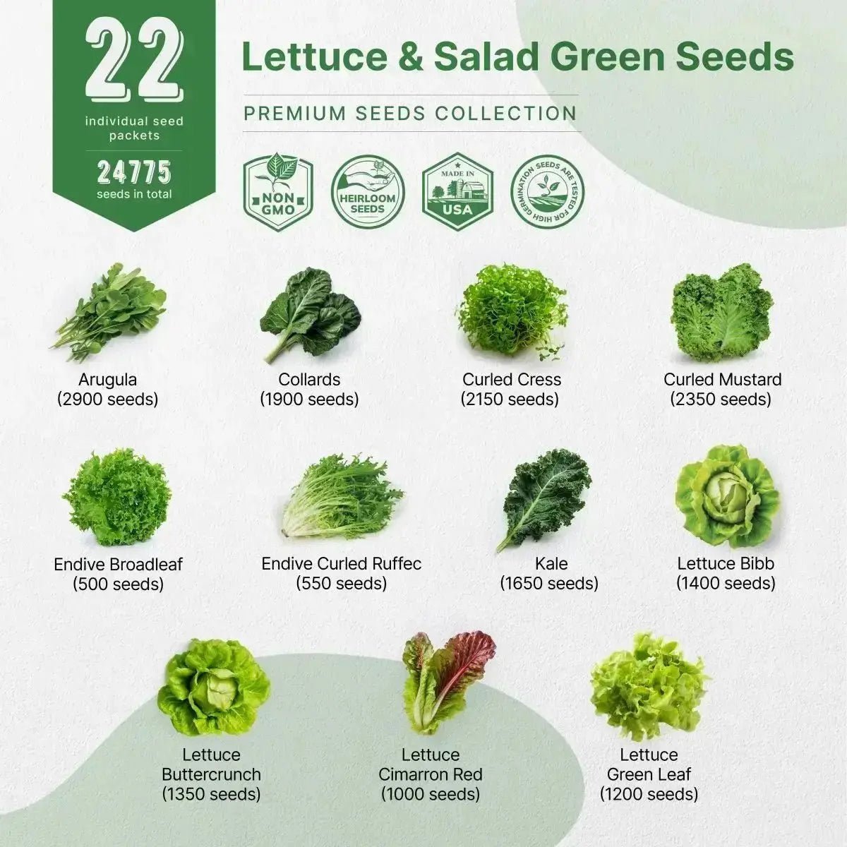 Elevate your gardening experience with the Organo Republic 22 Lettuce & Salad Greens Seeds Variety Pack. These non-GMO heirloom seeds offer incredible value, with over 24,700 seeds for less than $1.30 per variety. This pack includes a diverse range of lettuce and salad greens: Arugula, Collards, Curled Cress, Curled Mustard, Endive Broadleaf, Endive Curled Ruffec, Kale, Lettuce Bibb, Lettuce Buttercrunch, Lettuce Cimarron Red, Lettuce Green Leaf, Lettuce Iceberg, Lettuce Oakleaf Green, Lettuce Prizehead, Lettuce Romaine, Lettuce Royal Oakleaf, Mache Corn Salad, Mizuna, Radicchio, Sorrel, Spinach, and Swiss Chard.