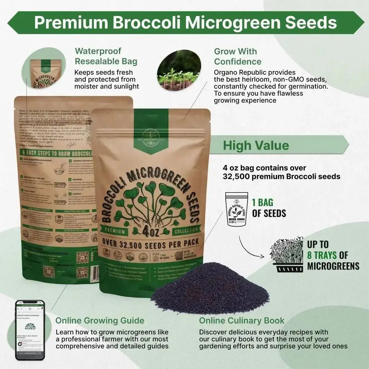Scan the QR codes on the seed packets to access our detailed growing guides. Learn how to grow broccoli microgreens like a professional and enjoy fresh, healthy meals any time of the year. Proudly sourced and packaged in the USA by Organo Republic, our seeds are trusted by gardeners nationwide and guaranteed by our commitment to quality.